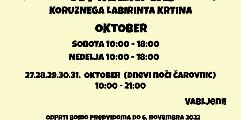 Sep302022Uncategorized @sl V oktobru bomo odprti v soboto in nedeljo 10:00 – 18:00. Konec oktobra za noči čarovnic 27, 28, 29, 30, 31. pa od 10:00 – 21:00. Vabljeni! Share this post Share on FacebookShare on Facebook Share on XShare on X Pin itShare on Pinterest Share on LinkedInShare on LinkedIn Post navigationPreviousPrevious post:Spusti palčkeNextNext post:Uganka o koruzi