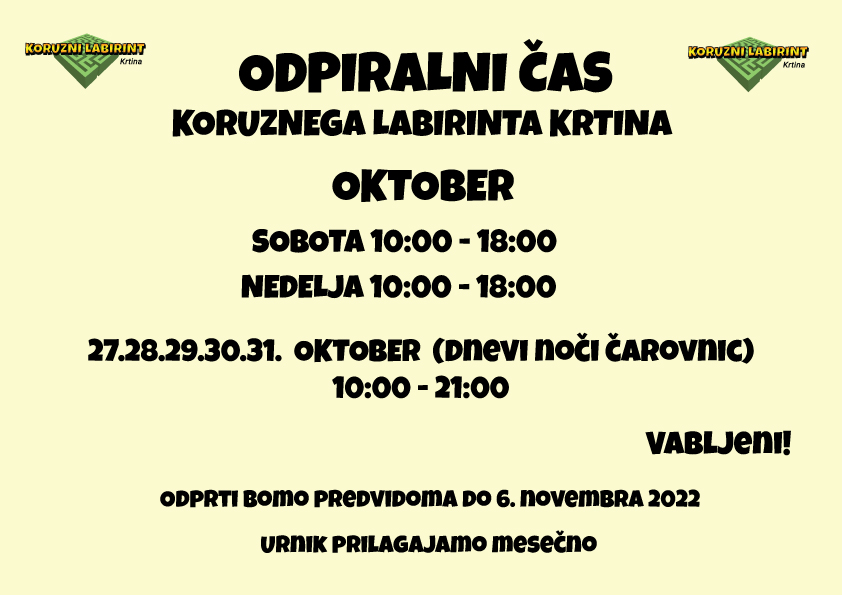 V oktobru bomo odprti v soboto in nedeljo 10:00 – 18:00. Konec oktobra za noči čarovnic 27, 28, 29, 30, 31. pa od 10:00 – 21:00. Vabljeni!